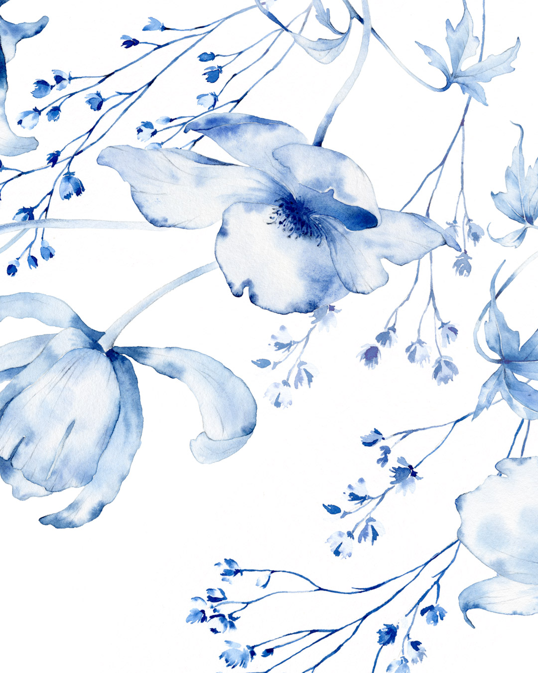 « C’est ma première expérience de peinture en monochrome. Les fleurs sont peintes à la main à l’aquarelle pour une collection qui rappelle mes origines portugaises. »